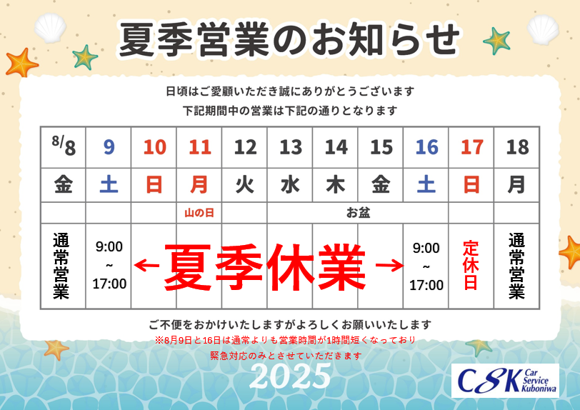 3月1日(土)は社内棚卸のため、受付1名・整備1名体制とさせていただきます。